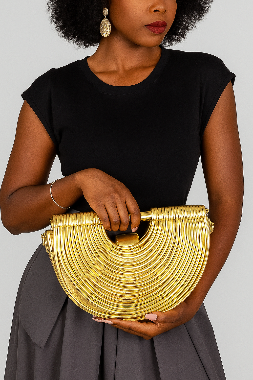 Elevate your look with the Black Arc Statement Handbag, a bold accessory designed to turn heads. Crafted with a sleek semi-circular silhouette and layered concentric ridges, this structured piece merges modern artistry with timeless elegance. Its deep black finish adds versatility, making it the perfect companion for both day and evening wear.