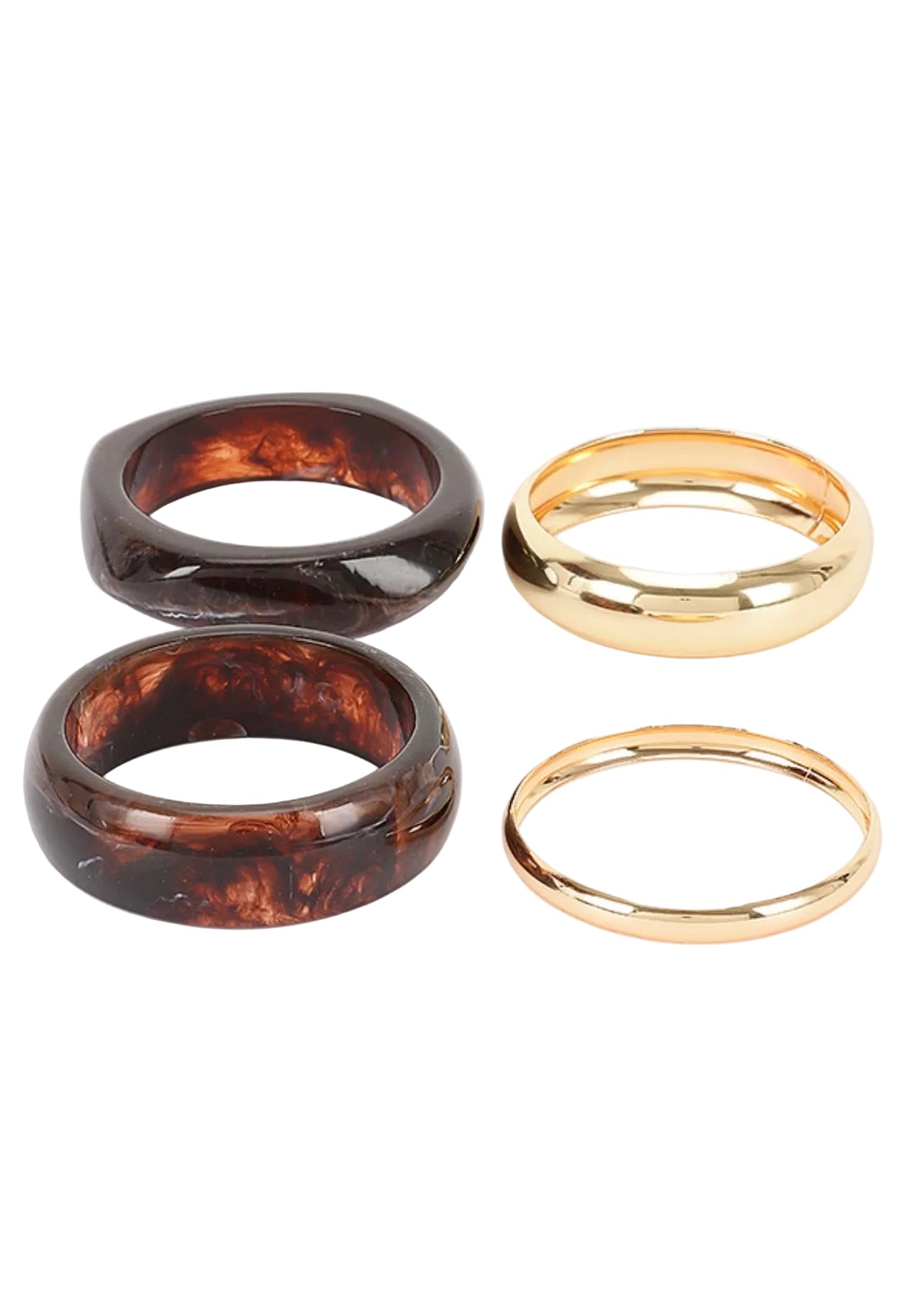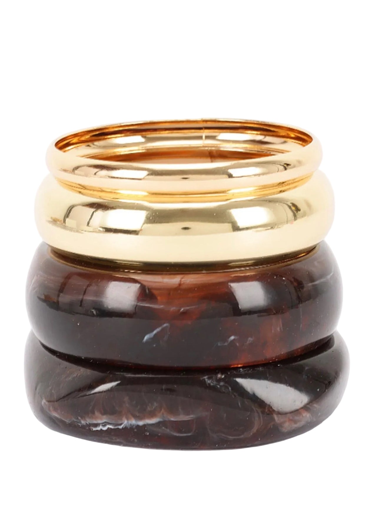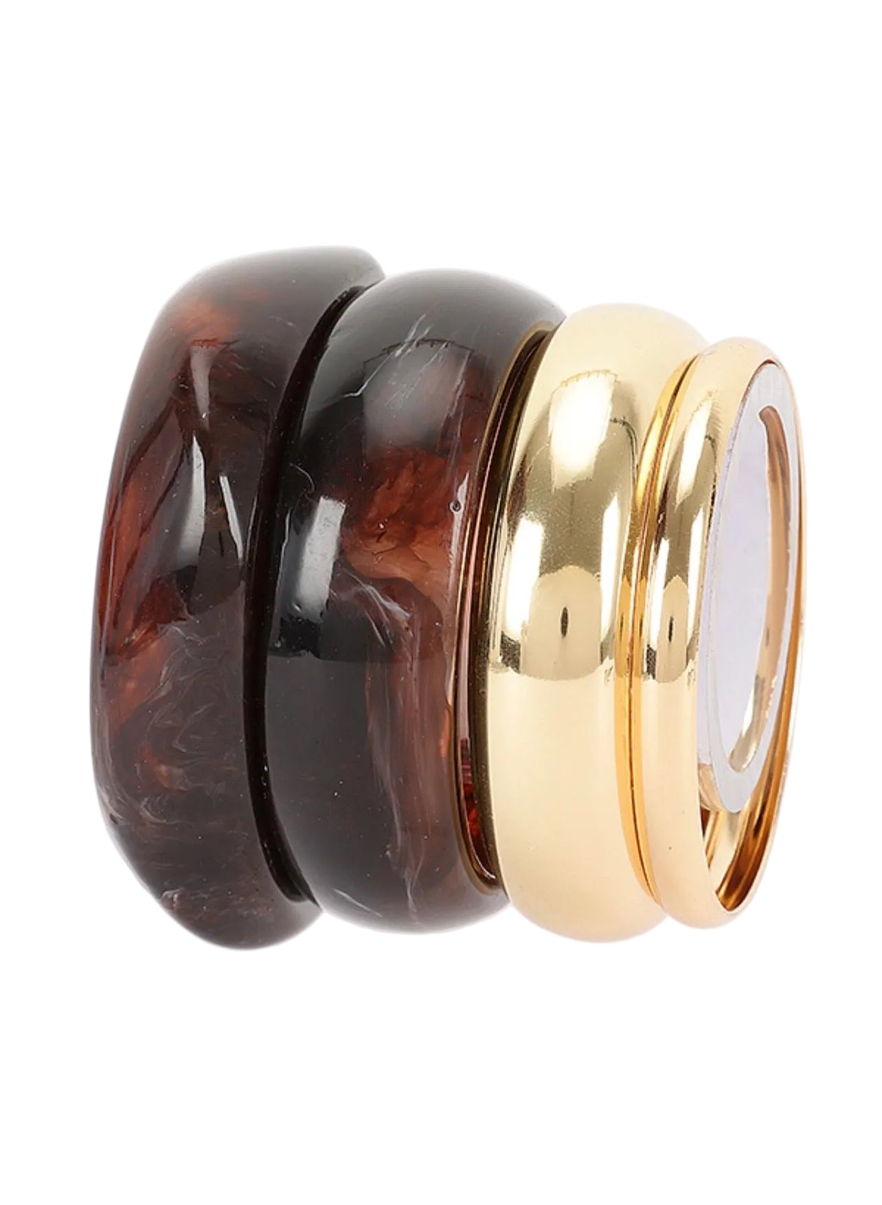 These chunky statement bracelets features a deep tortoiseshell base layered with a smooth, sculpted gold band for a modern, art-inspired silhouette. The juxtaposition of warm amber tones and polished gold creates a striking balance between vintage glamour and contemporary edge.